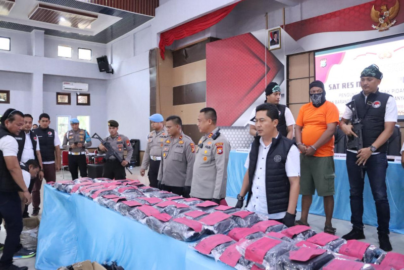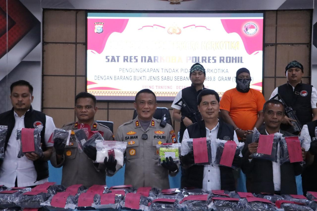 Konferensi pers dipimpin oleh Wadir Ditresnarkoba Polda Riau AKBP Nandang Lirama, didampingi Kapolres Rokan Hilir AKBP Isa Imam Syahroni, S.I.K., M.H., serta jajaran pejabat utama Polres Rohil dan awak media.