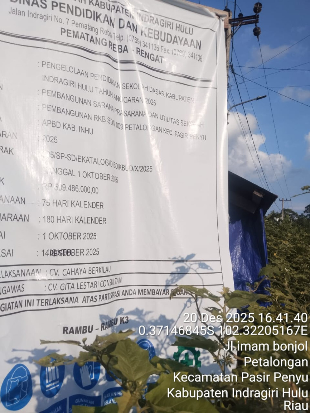 Pembangunan Ruang Kelas Baru (RKB) di SDN 009 Petalongan, Kecamatan Pasir Penyu, Kabupaten Indragiri Hulu, Provinsi Riau, menuai sorotan tajam dari masyarakat. Proyek yang bersumber dari Anggaran Pendapatan dan Belanja Daerah (APBD) melalui Dinas Pendidikan dan Kebudayaan Kabupaten Indragiri Hulu itu dinilai tidak hanya melewati batas waktu pelaksanaan, tetapi juga menunjukkan kualitas pekerjaan yang dipertanyakan.