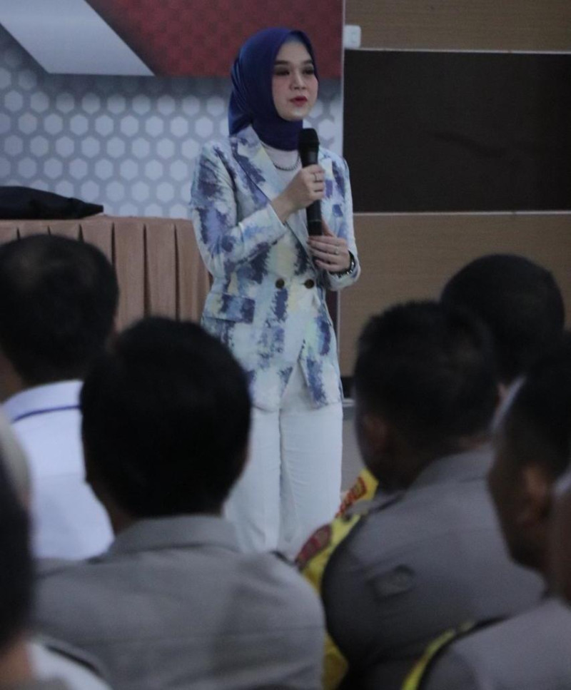 Naraajar Linda Nur Lestari. Pelatih peningkatan kemampuan personal tampil berbicara di hadapan umum untuk Personel Polres Rohil, Riau, di Aula Tunggal Panaluan Mapolres Rokan Hilir, Rabu (1/10/2025). [RIAU.WAHANANEWS.CO / Heri Syah]